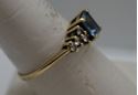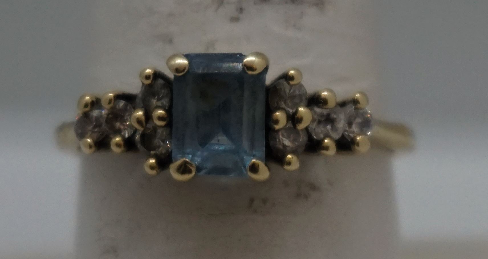 10KT YELLOW GOLD RING WITH BLUE STONE AND 8 CZS SIZE 8.5 2.4 GRAMS VERY GOOD CONDITION. 849283-1.