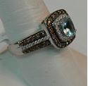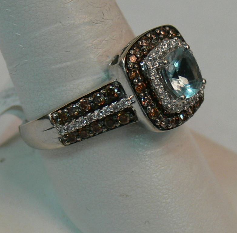 14K WHITE GOLD LEVIAN COLLECTION DIAMOND RING SZ-7.25 7.3G, LIGHT BLUE CENTER STONE, 37 WHITE DIAMONDS, 40 CHOCOLATE DIAMONDS, APPROX 1.0 CARAT TOTAL DIAMOND WEIGHT.