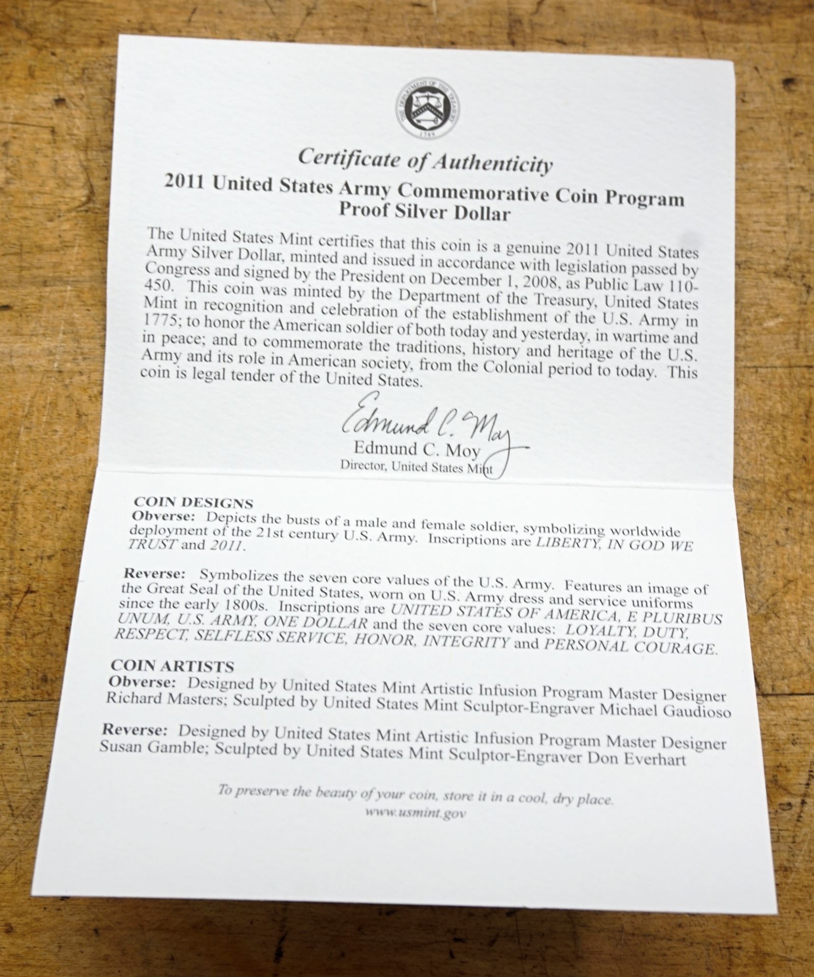 2011 United States Army Commemorative Proof Silver Dollar Coin US Mint w COA