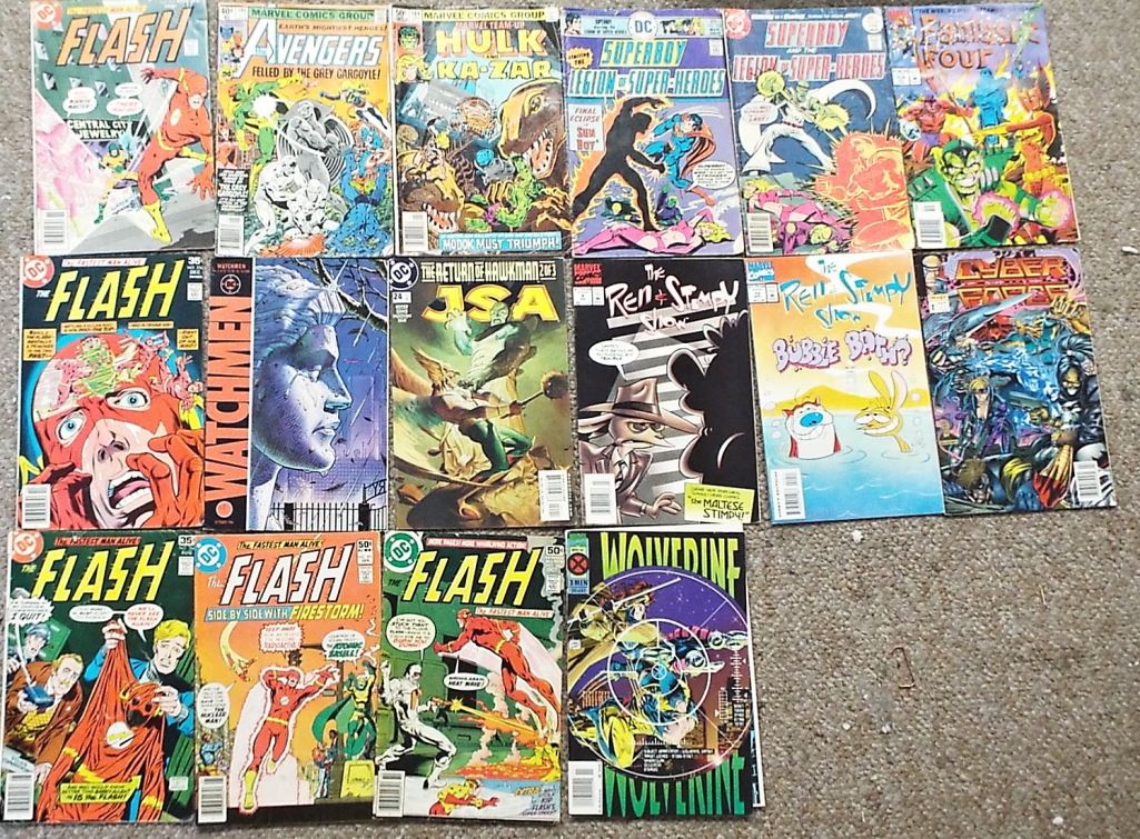 POTLUCK OF 28 ASSORTED COMIC BOOKS IRON MAN SPIDERMAN CYBER FORCE FANTASTIC FOUR FLASH SUPERBOY LEGION OF SUPER HEOROES THE REN + STIMPY SHOW THE RETURN OF HAWKMAN JSA WOLVERINE AVENGERS WATCHMEN HULK AND KA-ZAR . MIXED LOT, MIXED CONDITION, YOU CAN FIND A DIAMOND IN THE ROUGH. I DON'T GRADE BOOKS, THESE ARE NOT GRADED. WHAT YOU SEE IS WHAT YOU GET.