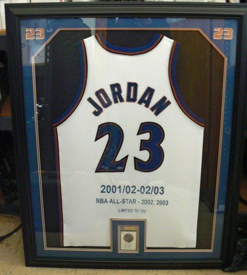FRAMED MICHAEL JORDAN SIGNED JERSEY AND CARD. GRADED BECKETT CARD SIGNED , AS WELL AS THE JERSEY BY MICHAEL JORDAN, WITH LETTER OF AUTHENTICITY