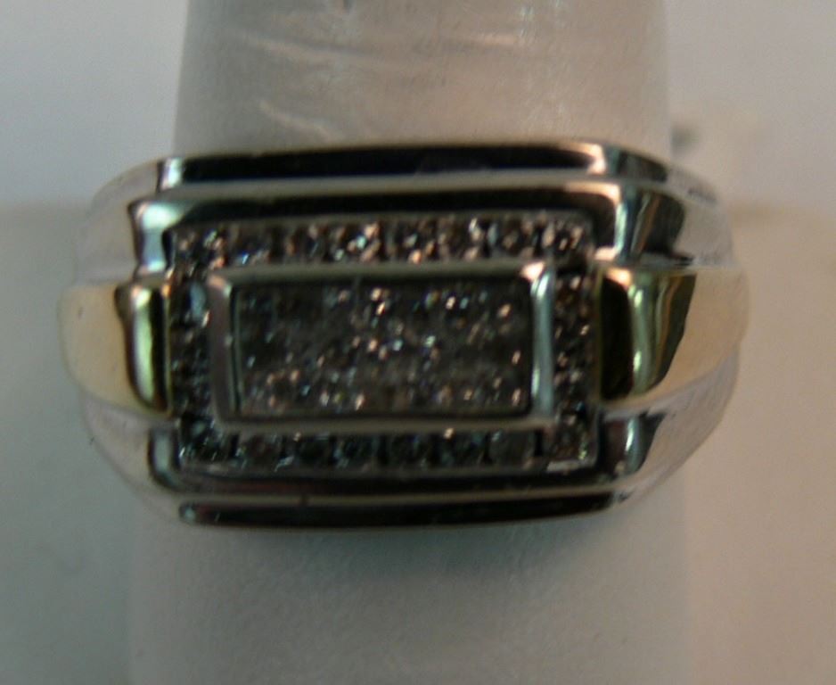 MENS RING SZ-10.25 10K WHITE GOLD W/ YELLOW BARS ON SIDE, 22 ROUND DIAMONDS APPROX .55 CARATS, 21 PRINCESS CUT DIAMONDS APPROX .45 CARATS, APPROX 1.0 CARATS TOTAL DIAMOND WEIGHT.