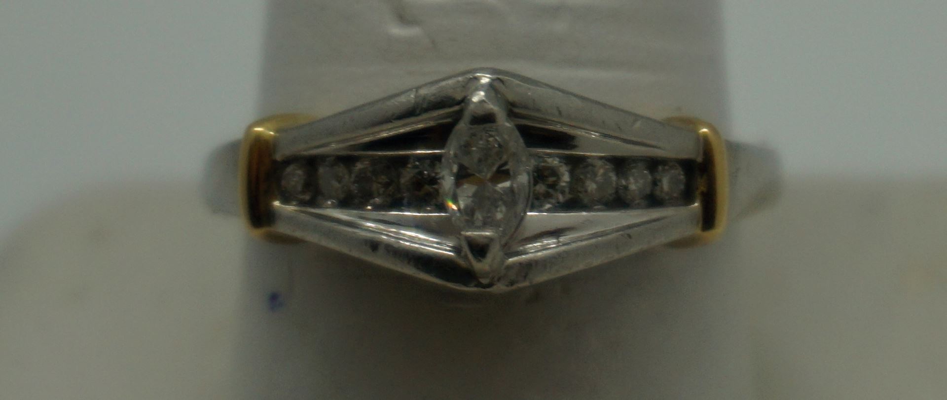 PLATINUM ENGAGEMENT RING 9.4GR WITH YELLOW GOLD AND DIAMONDS 0.50PTS (1 MARQUISE DIAMOND 0.20PTS 9 ROUND DIAMONDS 0.30PTS). SIZE 9.5. PRE OWNED. GOOD CONDITION. 837438-1.