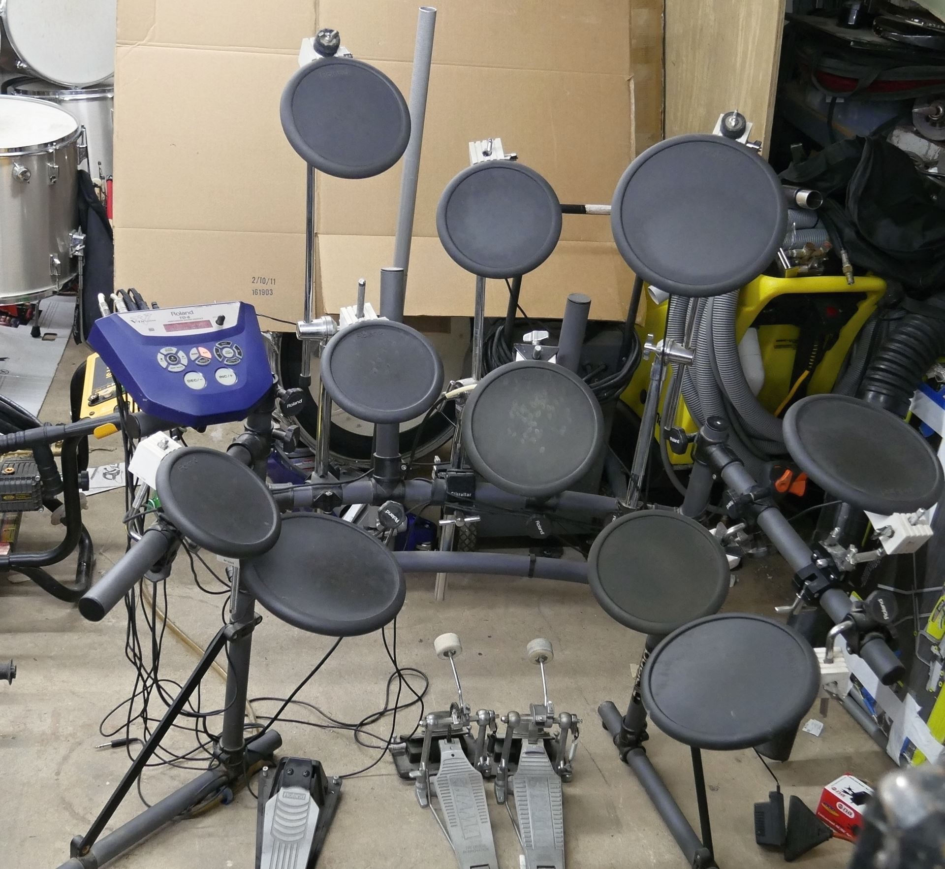 ROLAND 14 PIECES DRUM SET .SET INCLUDE- 1)ROLAND TD-6 BRAIN 2) 2 BASE PEDALS KD7 (TAMA BODY) 3) 1 FD-6 HIGH HAT PEDAL 4) 4 PD7 DRUMS 5) 2 PD8 DRUMS 5) 4 PD9 DRUMS SET COMPLETED. WITH CORDS. USED. TESTED. IN A GOOD WORKING ORDER.